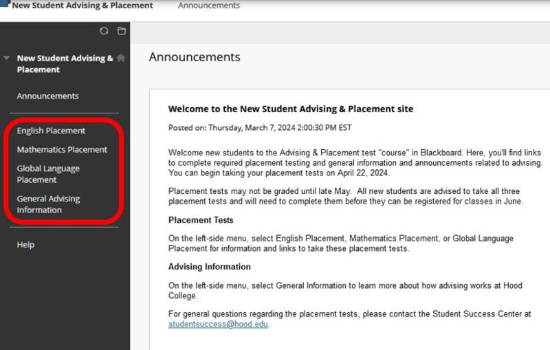 The placement tests can be found in Blackboard (hood.blackboard.com) under a course titled "New Student Advising and Placement." It is best to log into Blackboard from a computer, but a tablet can work as well. It is not advised to take your placements from a cell phone. Your Blackboard login is your Hood email and password.